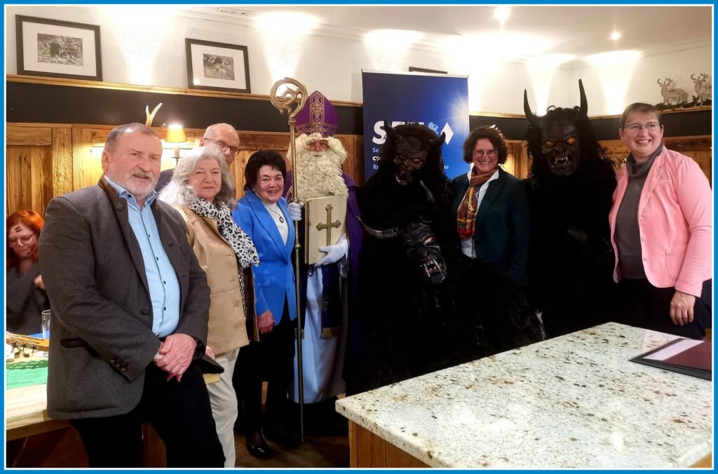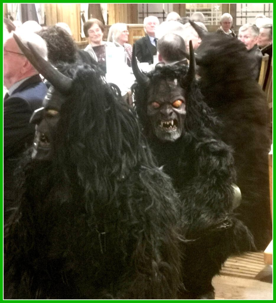 Als besondere Überraschung schepperten die „Oaringer Krampein“ aus Ainring im Berchtesgadener Land in den Saal, begleitet von Nikolaus und Engerl. Nikolaus sprach die Gäste mit humorvollen Worten auf ihre Eigenschaften an. Einige Gäste lachten herzlich über ihre etwas rußigen Gesicher, die ihnen die Krampein verliehen hatten, so auch die Göpferdinger Damen. Der Auftritt erfreute alle. Das Engerl verteilte dazu Süßigkeiten und weihnachtliche Anhänger an alle Gäste. Bei netter Unterhaltung endete die gelungene schöne Feier.“